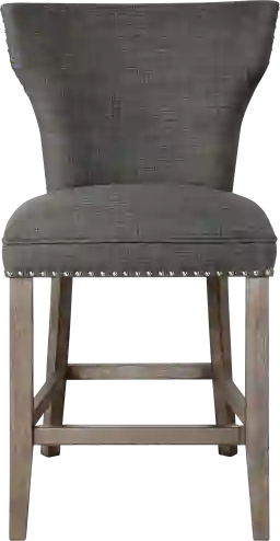 The Vanderhorst counter height stool features a supportive comfort in a curved back design, covered with warm charcoal gray linen and accented by polished nickel nail head trim. Complete with a honey stained frame is finished with heavy gray wash, with an antique brass finished kick plate. Seat height is 25". Customer assembly is required.