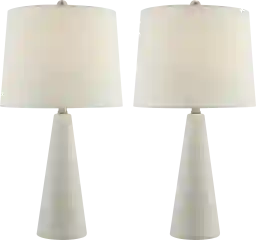 The Varn Lane lamp, set of 2 offers a textured look and retro style. With a soft white finish over textured conical ceramic bodies, they create custom vibes and become a mainstay in room decor. White fabric tapered drum shades add a stylish touch. Partial assembly may be required.
