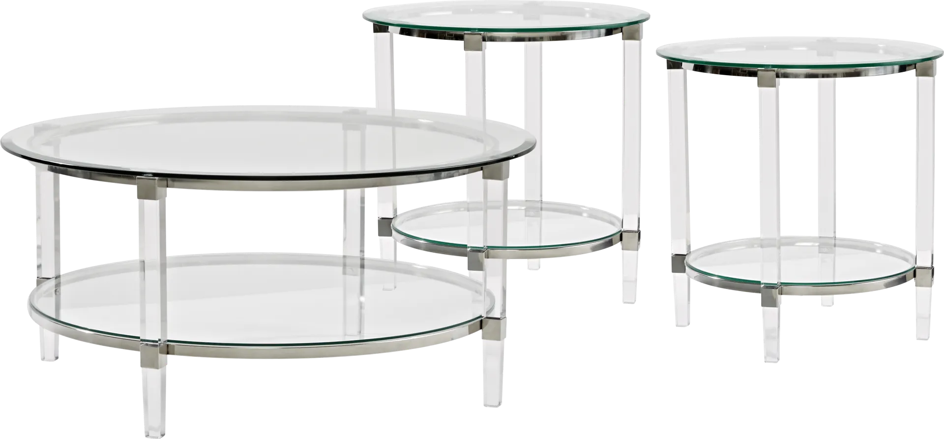 Contemporary style and a sleek aesthetic make the Varna table set a beautiful choice. The round cocktail table and end tables boast tempered glass tops and lower display shelves supported by clear acrylic legs. Silver finished metal accents complete the modern aesthetic. Customer assembly required.