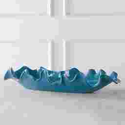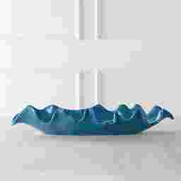 This Vasilina ceramic bowl models organic curved edges that create a feminine look and is finished in a striking gloss blue glaze. May also be hung on the wall.