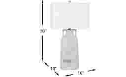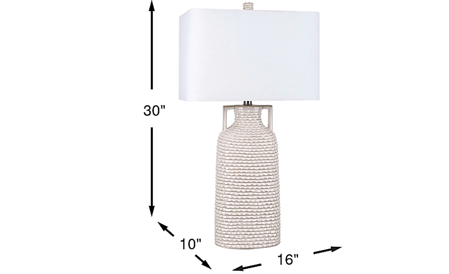 Satisfy your aesthetic desires with the Vaux Street table lamp. Its off-white base features a ceramic construction, lending a shiny, shimmering appearance. Creating visual appeal, tiny lines with waves of texture run from top to bottom. Plus, two handles at the top allow for easy mobility when it's time to redecorate. This lamp accommodates a maximum 100-watt standard bulb and includes a convenient three-way switch.