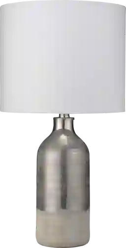 This lamp features a classic "bottle" style base made of high-quality ceramic, finished with a unique iridescent sheen and pewter glaze. This blend of a polished yet rustic aesthetic is a hallmark of transitional design, allowing it to bridge the gap between traditional and modern decor. The white linen drum shade adds a touch of casual glamour that softens the metallic silver tones of the base.