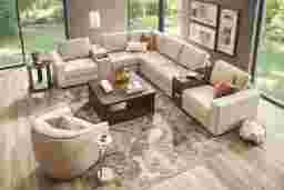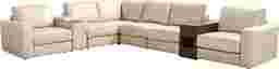 Confident forms and inviting comfort find one another on the Venice Modular, where intentional design details and unique mixed materials blend into a space with a perfect balance of comfort and contemporary grace. Each seat features almond-colored top grain leather where the body touches, with luxurious accents like welted seams and decorative top stitching throughout. A contrasting console with dark brown woodgrain features a swivel table, USB charging and plenty of hidden storage space for incredible convenience. Also included, a media console expands on the experience with wireless charging, hidden cupholders, lift-top storage, and bluetooth-enabled audio with built-in controls. With wonderful efficiency, easy-to-use modular connectors make it simple to reconfigure this seating solution to fit your needs and taste anytime. Includes LAF chair, 3 armless chairs, non-media console, media console, wedge, and RAF chair. Upholstery: top grain leather where the body touches with polyurethane sides and back.