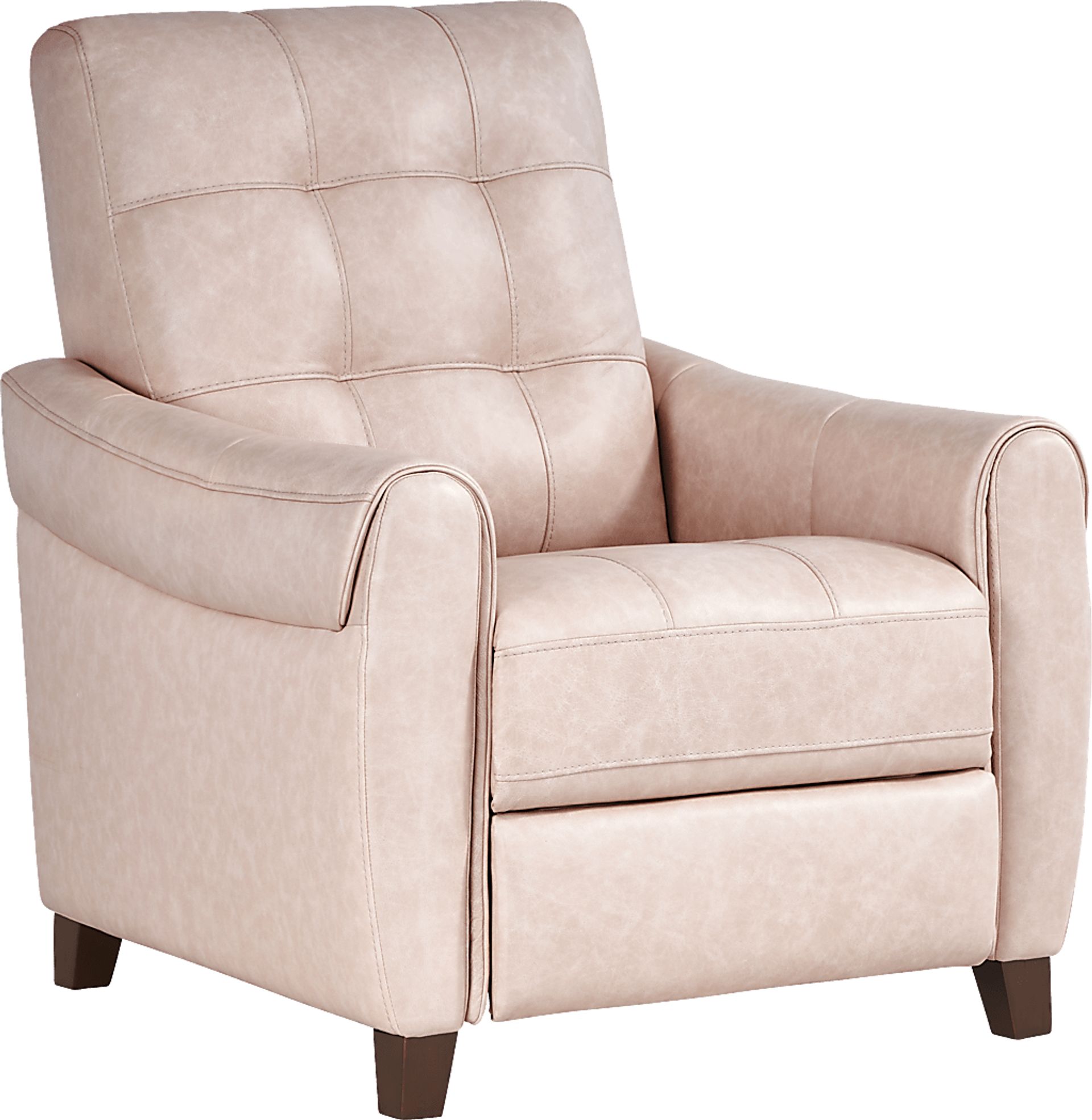 Casual everyday comfort is easy to enjoy when the laidback luxury of the Ventura Square push back recliner comes home. Upholstered in sumptuous top grain leather where the body touches, this piece features an intriguing wrap-over effect on its contoured mailbox arms. Tufting on the back cushions provides a stunning style detail enhanced by the elegant blush tone. With the inviting appearance of a standard armchair, this push back recliner allows you to lean back into comfort by simply shifting your own weight backwards while seated. The sublime look wouldn't be complete without the addition of tapered legs, crafted in warm brown finish. Top grain leather where the body touches & polyurethane fabric sides & backs.