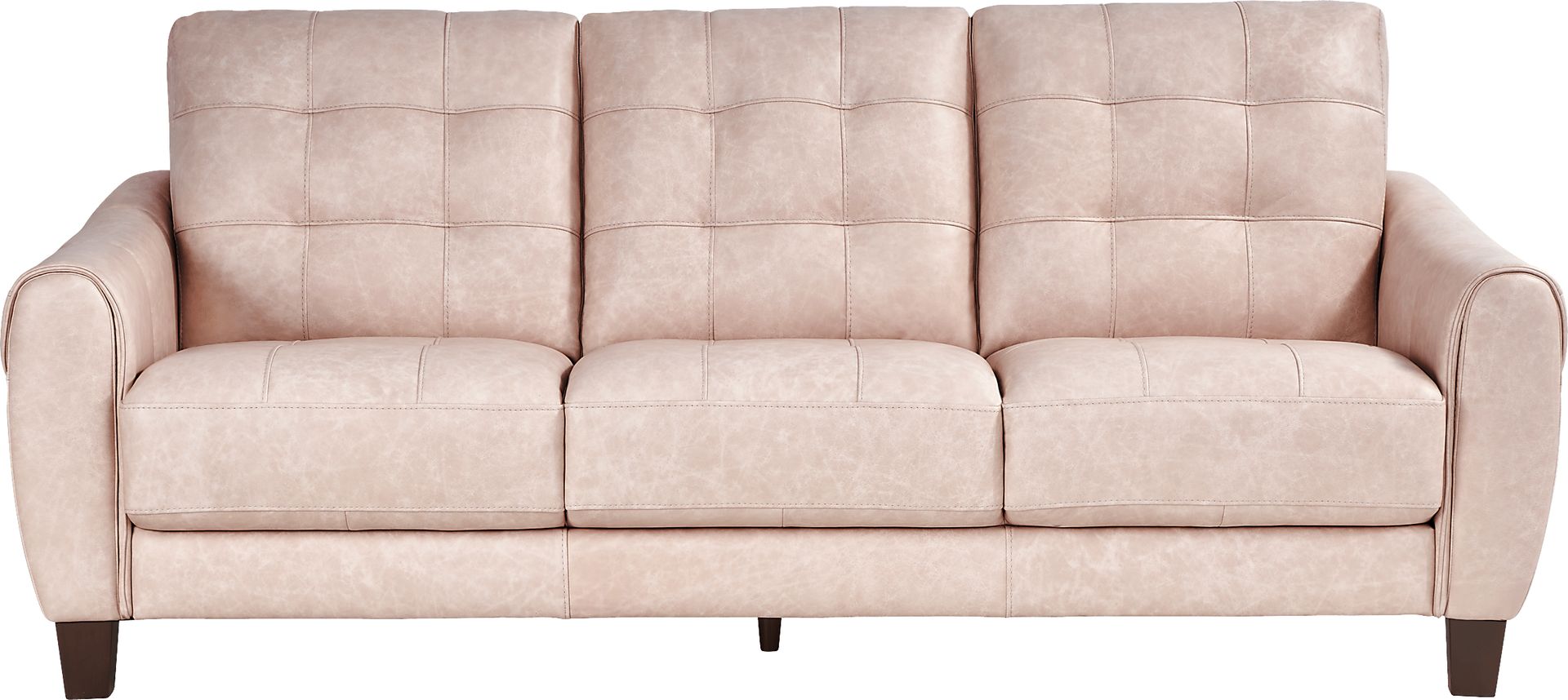 Casual everyday comfort is easy to enjoy when the laidback luxury of the Ventura Square sofa comes home. Upholstered in sumptuous top grain leather where the body touches, this piece features an intriguing wrap-over effect on its contoured mailbox arms. Tufting on the back cushions provides a stunning style detail enhanced by the elegant blush tone. This sublime look wouldn't be complete without the addition of tapered legs, crafted in warm brown finish. Top grain leather where the body touches & polyurethane fabric sides & backs.
