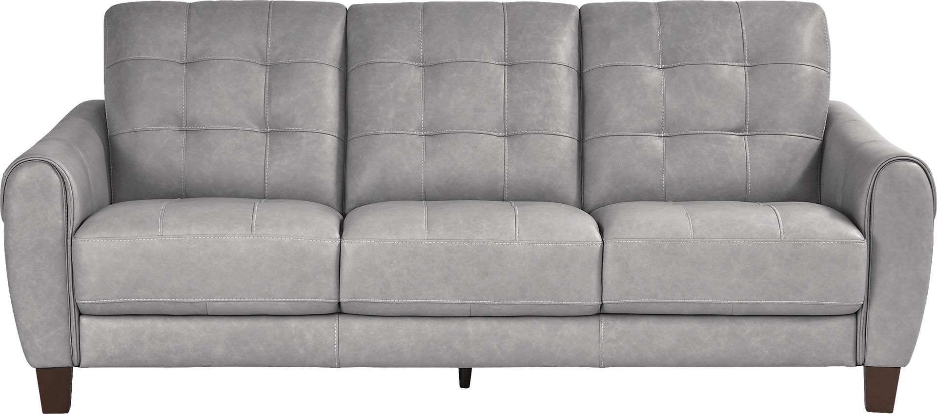 Casual everyday comfort is easy to enjoy when the laidback luxury of the Ventura Square sofa comes home. Upholstered in sumptuous top grain leather where the body touches, this piece features an intriguing wrap-over effect on its contoured mailbox arms. Tufting on the back cushions provides a stunning style detail enhanced by the elegant gray tone. This sublime look wouldn't be complete without the addition of tapered legs, crafted in warm brown finish. Top grain leather where the body touches & polyurethane fabric sides & backs.