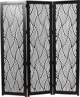 Inspired by sleek elegance and clean lines, a minimalistic design offers effortless luxury with monochromatic tones and bold, angular structures. The Vepion room divider screen is made of mango wood, MDF, and iron, making it durable and long-lasting. This divider screen and folding privacy screen, has a distressed matte black that adds a contemporary touch to any room. It features panels that have wave shaped cutouts and can be set up in different configurations. Customer assembly is required.
