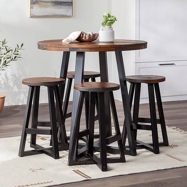 Rustic, timeless, and tastefully distressed, this Verdenbruk solid wood dining set will take your at-home eatery from bland to blissfully bucolic. Gather around the trendy, circular counter-height tabletop with friends and family for your favorite lasagna dish or a rousing game of cards. With its sturdy build, sustainable, solid pine frame, and modern take on countertop seating, this dining table and four matching stools will be your new favorite hub, whether the set sits in your dining room, kitchen, or apartment. Customer assembly is required.