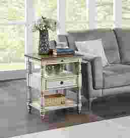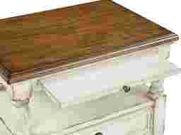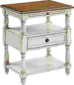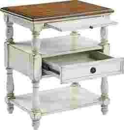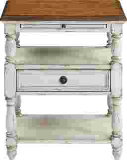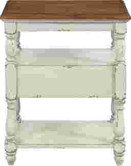 This Verdome chairside table has all the dings and whistles you have been looking for! Gently distresses in an aged cream with a natural wood tone top, and turned legs that support two open shelves as well as a pull out drawers in the middle and a slide out shelf on top, this Chairside gives you a multitude of display and storage options. Perfect by your sofa or reading chair, and an asset to any room or decor. Customer assembly is required.