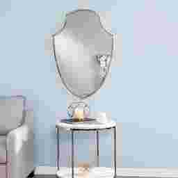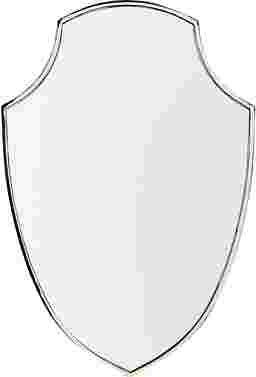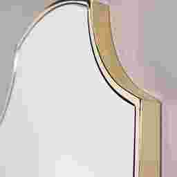 Gaze into eclectic style with this gaze-worthy Viaduct wall mirror. Crafted in a unique shield design, the slender brass frame brings a subtle hint of minimalist chic. Hang this decorative accent mirror in a dining or living room as a glamorous focal point, or place it above a console or vanity for room-opening reflection.
