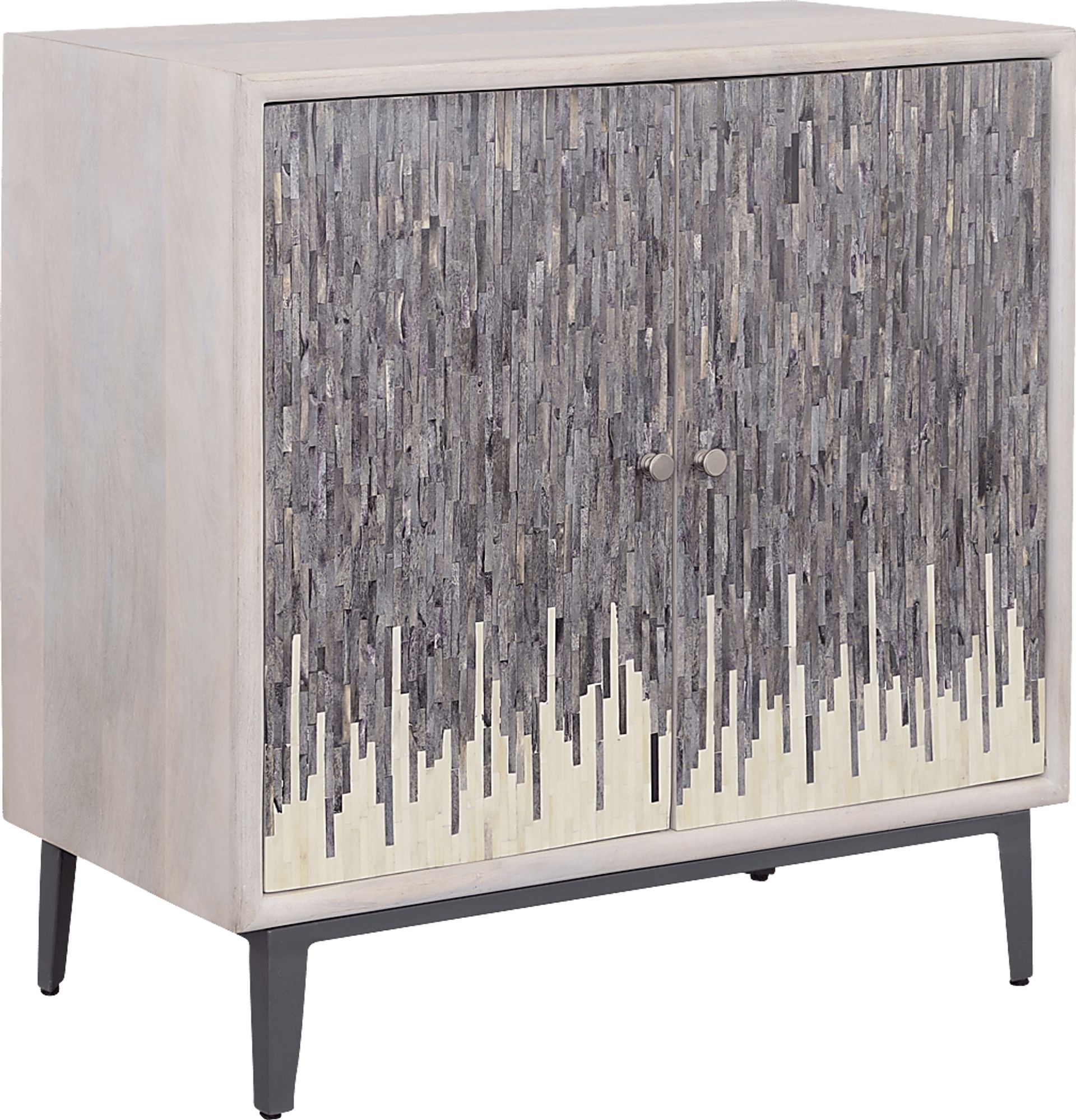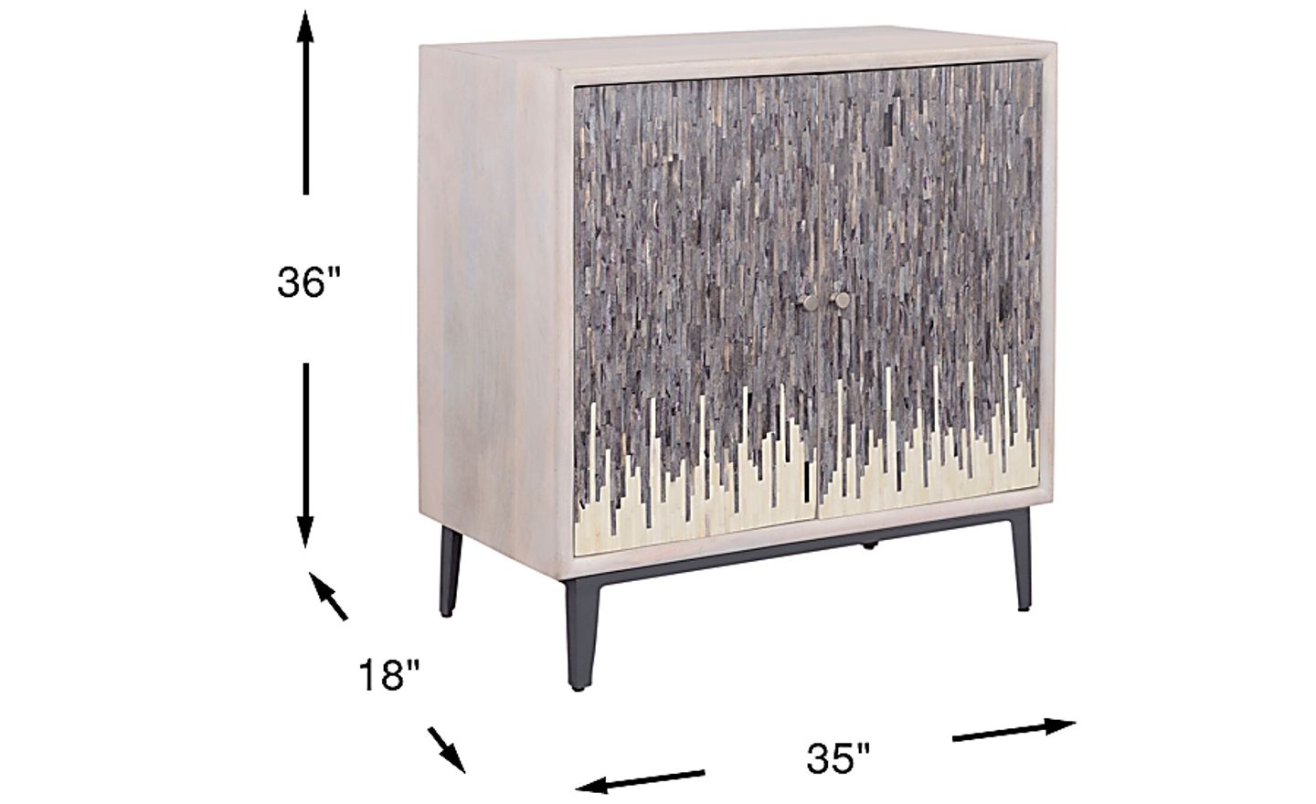 Artful sophistication flows from the Vidal credenza, infusing the room with sculptural elegance and charismatic charm. Finished in a chic whitewash, this contemporary piece showcases two bone inlayed doors with two-tone tiles for a bold, contrasting flair. Behind each door are two spacious shelves and wire management holes for organized storage. Iron knobs in a silver finish add a subtle accent while the black metal base and legs provide support and a sleek final touch.