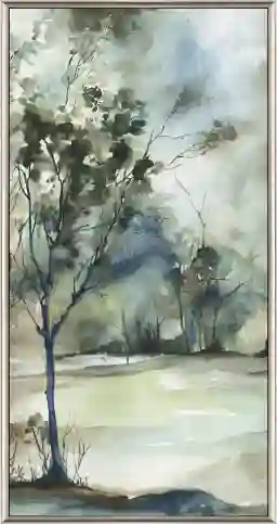 A floater frame provides a sophisticated, gallery-style appearance by leaving a small gap between the edge of the canvas and the frame. This makes the artwork appear as if it is "floating" within the silver border. This specific frame features a warm silver finish with satin black sides, offering a multi-dimensional look that bridges the gap between modern metallic accents and traditional dark wood finishes.