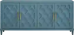 Absolutely. At 70 inches wide, this cabinet offers a stable and expansive surface that can accommodate most large flat-screen televisions. Its contemporary "glam" styling, featuring sculpted diamond-patterned doors and a soothing aqua finish, allows it to function as a chic media console that elevates the design of a modern living room or entertainment space.