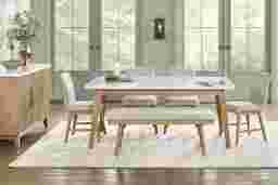 No more reservations with the Viola dining room's lively feel, bringing the goodwill and cheer of a fun night out home. Constructed of wood solids and ash veneers, this contemporary collection boasts an irresistible set of complementary colors with its natural finish, gray upholstered seats and backs, and rectangular marble tabletop. The base features canted legs for a minimalist silhouette and comes with a dining bench that includes storage space for extra dining room essentials. The set is completed by 4 bar-style side chairs that are as comfortable for a night of dinner and conversation as they are gorgeous to the eye.