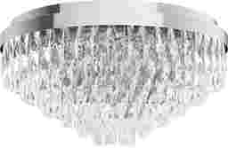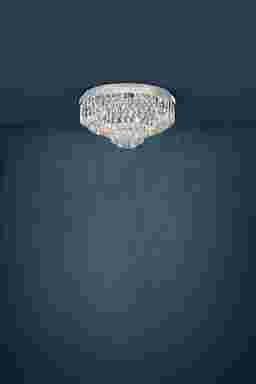 The Virgil Sea Silver Flush Mount brings timeless glamour to any interior. Crafted from chrome-finished metal, its oversized round silhouette is layered with tier upon tier of crystal-inspired beveled glass bars. These high-end faceted pieces catch and reflect the light to create a dazzling, sophisticated sparkle throughout the room. With its tapered profile and radiant elegance, this ceiling light makes a bold statement in living rooms, dining spaces, or bedrooms. Professional installation by an electrician is recommended.