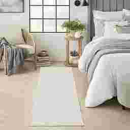 Ivory and beige tones are excellent for brightening narrow or dark corridors, making them feel more open. To maintain its appearance, vacuum the rug regularly without a beater bar to preserve the raised texture. For spills, our experts suggest immediate blotting with a dry cloth followed by spot cleaning with a mild detergent and cool water. The monochromatic, tone-on-tone design is particularly effective at subtly concealing the inevitable wear of daily use.