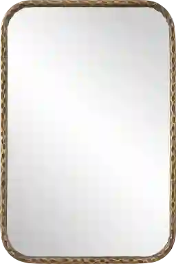 This mirror is constructed with a hammered textured iron frame, a material highly valued in home decor for its exceptional structural integrity and resistance to warping. Unlike wood, which can expand or contract with temperature changes, the iron frame provides a stable housing for the glass. The aged bronze finish serves as both a decorative element and a protective layer for the metal underneath.