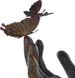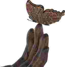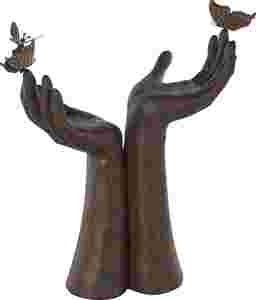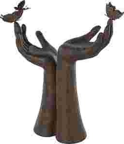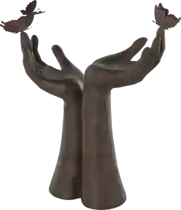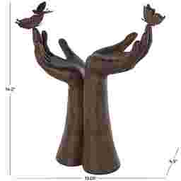 Inspired by sleek elegance and clean lines, a minimalistic design offers effortless luxury with monochromatic tones and bold, angular structures. The Voloa Sculpture is crafted from durable polystone and resin for longevity. The decorative statue features a dark brown color with copper distressing. This polystone statue boasts intricate hands with butterflies perched on the fingertips.