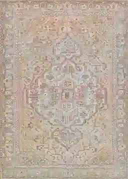 This rug utilizes advanced digital printing technology to replicate the ornate luxury of handmade Persian rugs, featuring nomadic tribal patterns and royal motifs. The distressed finish and muted palette of peach, orange, and blue allow it to serve as a "new-traditional" anchor. It is highly adaptable, providing a sophisticated contrast to the clean, sharp lines of modern furniture or adding a layer of curated, "old-world" warmth to an eclectic, transitional space.