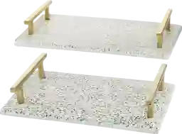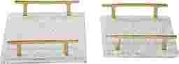 Indulge in the glamorous luxury of plush textures, dazzling details, and sleek finishes to elevate your home and add a sophisticated flair. The Vosno decorative tray set is crafted with marble stoneware and aluminum. Ceramic trays highlight an ash white background finish with black freckled details. This decorative tray set features polished plates with gold side handles. Each white marble tray measures 16.0L x 9.85W x 2.55H, 12.8L x 8.85W x 2.5H inches, and collectively weighs 11.41 lbs.