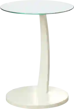 This contemporary style white bentwood Vultee accent table is a convenient solution for placing snacks or drinks near your sofa or chair. A circular white base and stand offer sturdy support, while the 1/2" thick clear round tempered glass top has plenty of surface space for putting a cup of tea, snacks, or a tablet. This snack table is also ergonomically designed to gently curve forward so your drinks are within easy reach! Functional and stylish, this accent table is a must-have for any living room, family room, den, or office space. Customer assembly is required.