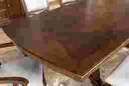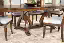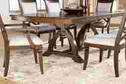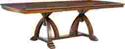 Beautifully detailed, the Walnut Place dining table will be a welcoming place for special meals and parties. Patterned Mindy veneers on the table's top echo the shapes and lines found throughout the collection. The double pedestal base, formed with shaped triple legs, offers support with impressive visual interest. When extra guests arrive simply add the 24 inch leaf to extend the 72 x 44 inch table to 98 inches.