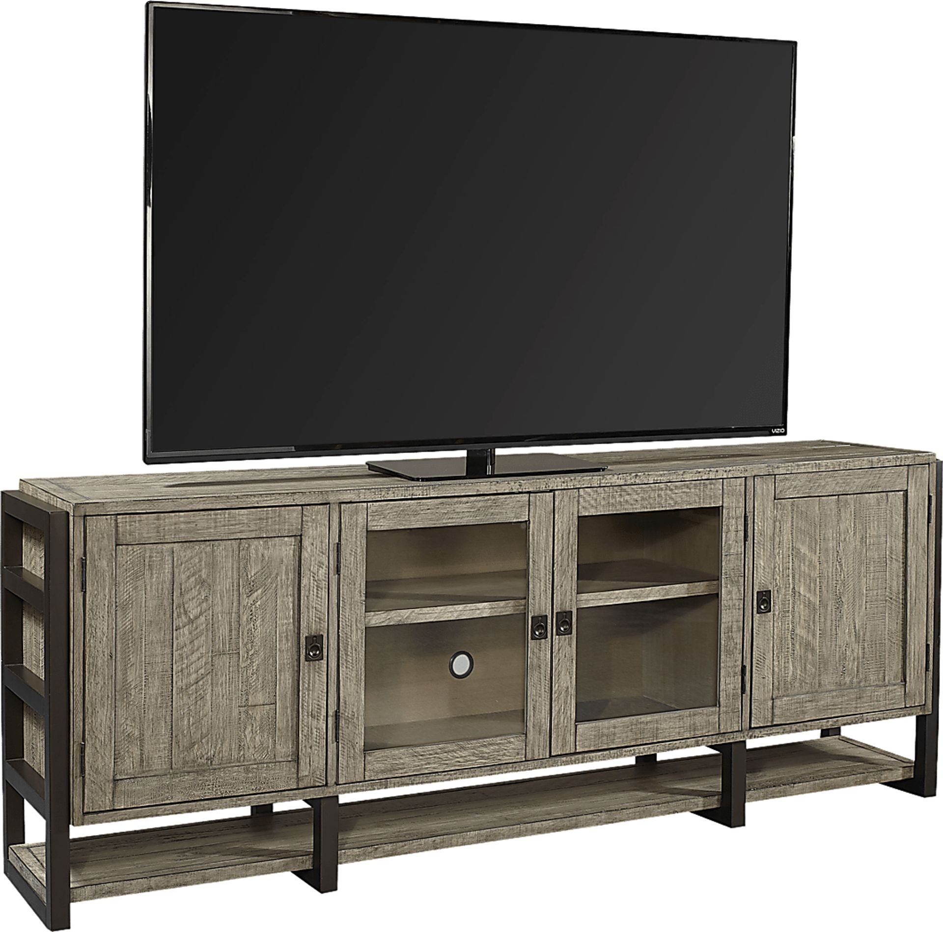Bring rustic charm and versatility to your living room or entertainment space with the stylish Water Mill TV console. This 85-inch piece is crafted of wood solids in a cinder gray finish that you and your guests will love. With the help of this console's ample storage space, you can keep your favorite media, decor and much more organized with ease.