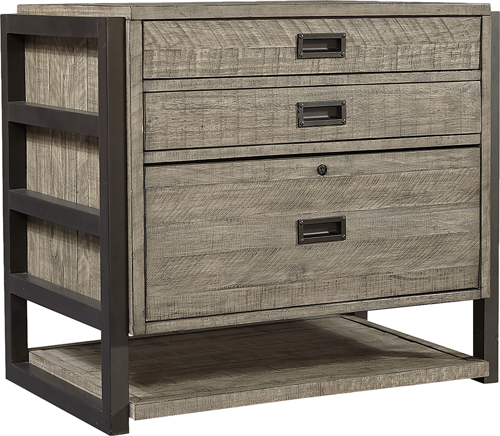 Complete your home office space with the versatile and stylish Water Mill file cabinet. This rustic piece comes in a gray finish and features three drawers that are perfect for storing files, stationery, and hanging folders. The sleek black base features a ladder-style design and an additional open shelf on the bottom.