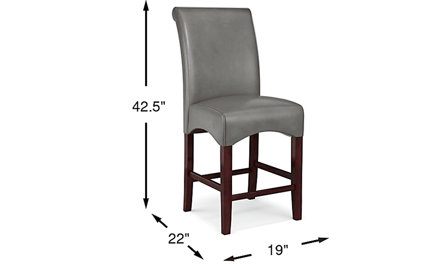 The Watercolor counter height stool offers comfortable and stylish seating for almost any dining area. Ultrahyde upholstery in a light charcoal color is supple, durable and easy to clean. Stitching detail enhances the back of the chair. A padded seat and merlot finished wood legs provide support.