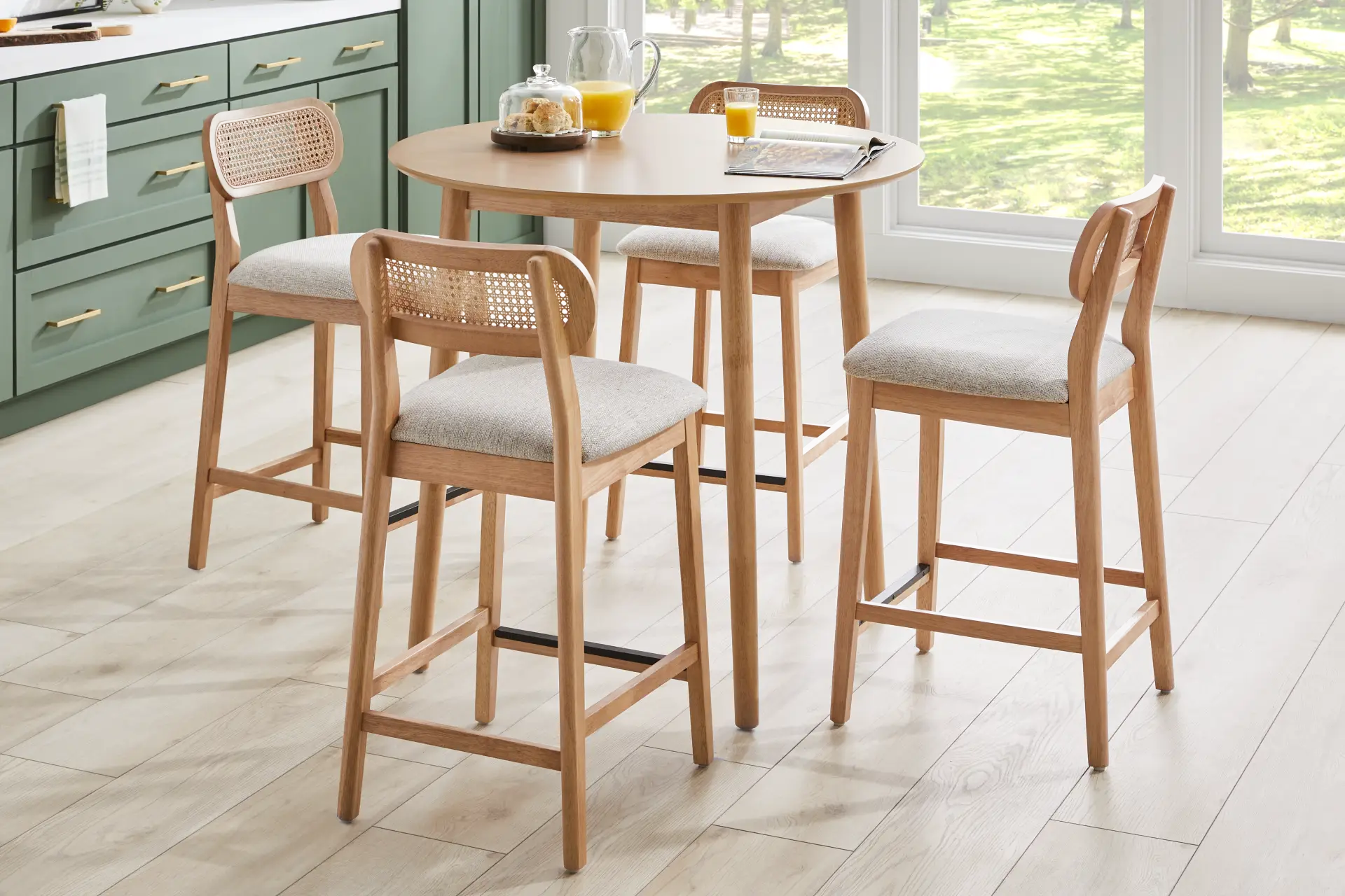 With an inviting, cheerful style that brings great times and wide smiles, the Watertown counter height dining room sets the tone for the joy of meals shared. Okoume wood veneers in a natural finish are shaped into organic curves in a contemporary take on midcentury-inspired design. Each stool sports an upholstered seat in beige, with woven rattan panels in the oval backs. At the center of the set is the counter height 39" x 39" round dining table, standing on turned, slightly canted legs.