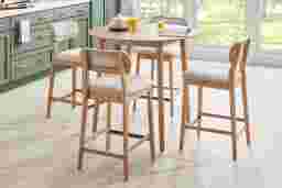 With an inviting, cheerful style that brings great times and wide smiles, the counter height Watertown dining table sets the tone for the joy of meals shared. Okoume wood veneers in a natural finish are shaped into organic curves in a contemporary take on midcentury-inspired design. A set of turned, slightly canted legs hold up the 39" round tabletop.