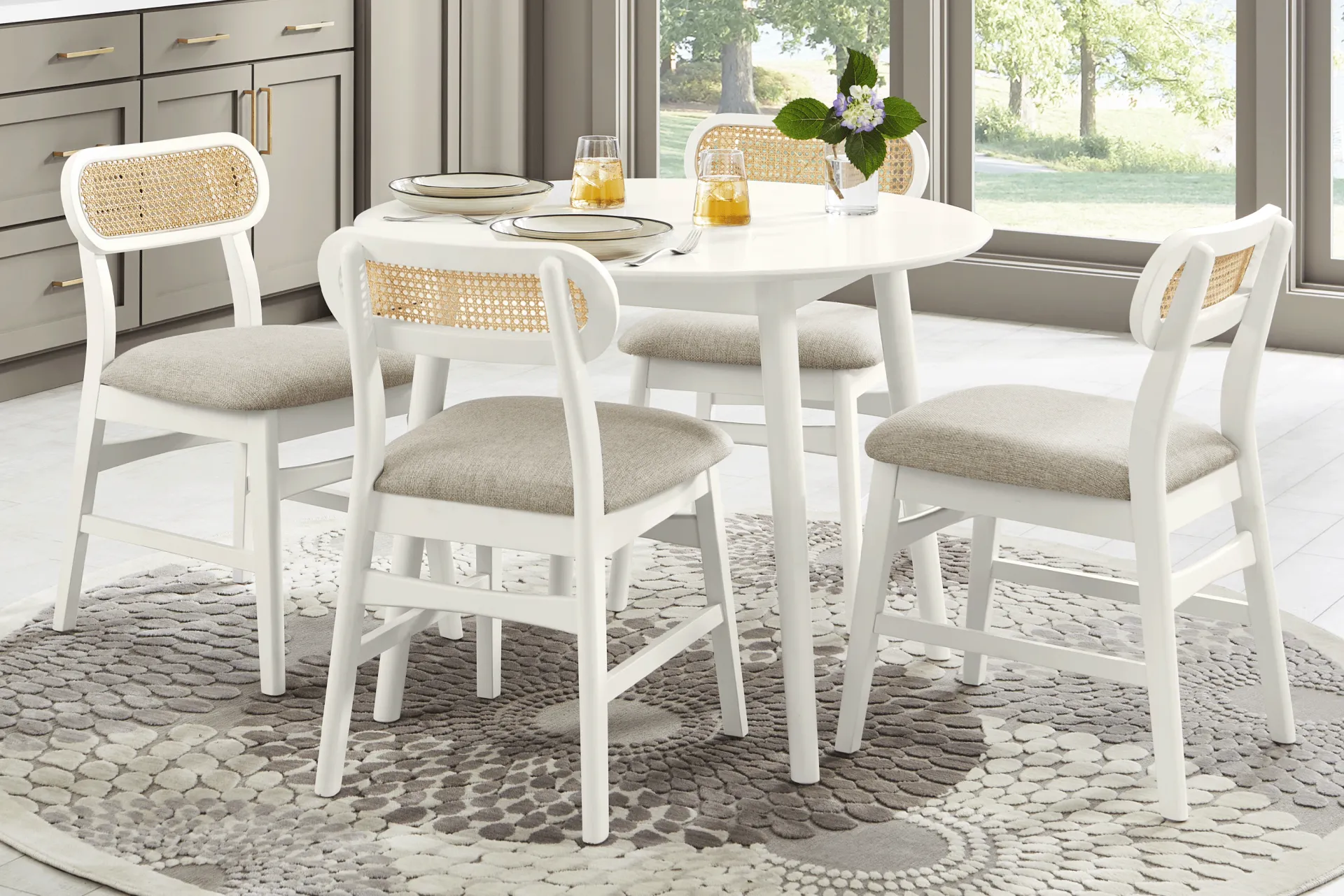With an inviting, cheerful style that brings great times and wide smiles, the Watertown dining room sets the tone for the joy of meals shared. Okoume wood veneers in a white finish are shaped into organic curves in a contemporary take on midcentury-inspired design. Each chair sports an upholstered seat in beige, with woven rattan panels in the oval backs. At the center of the set is the 39" x 39" round dining table, standing on turned, slightly canted legs.