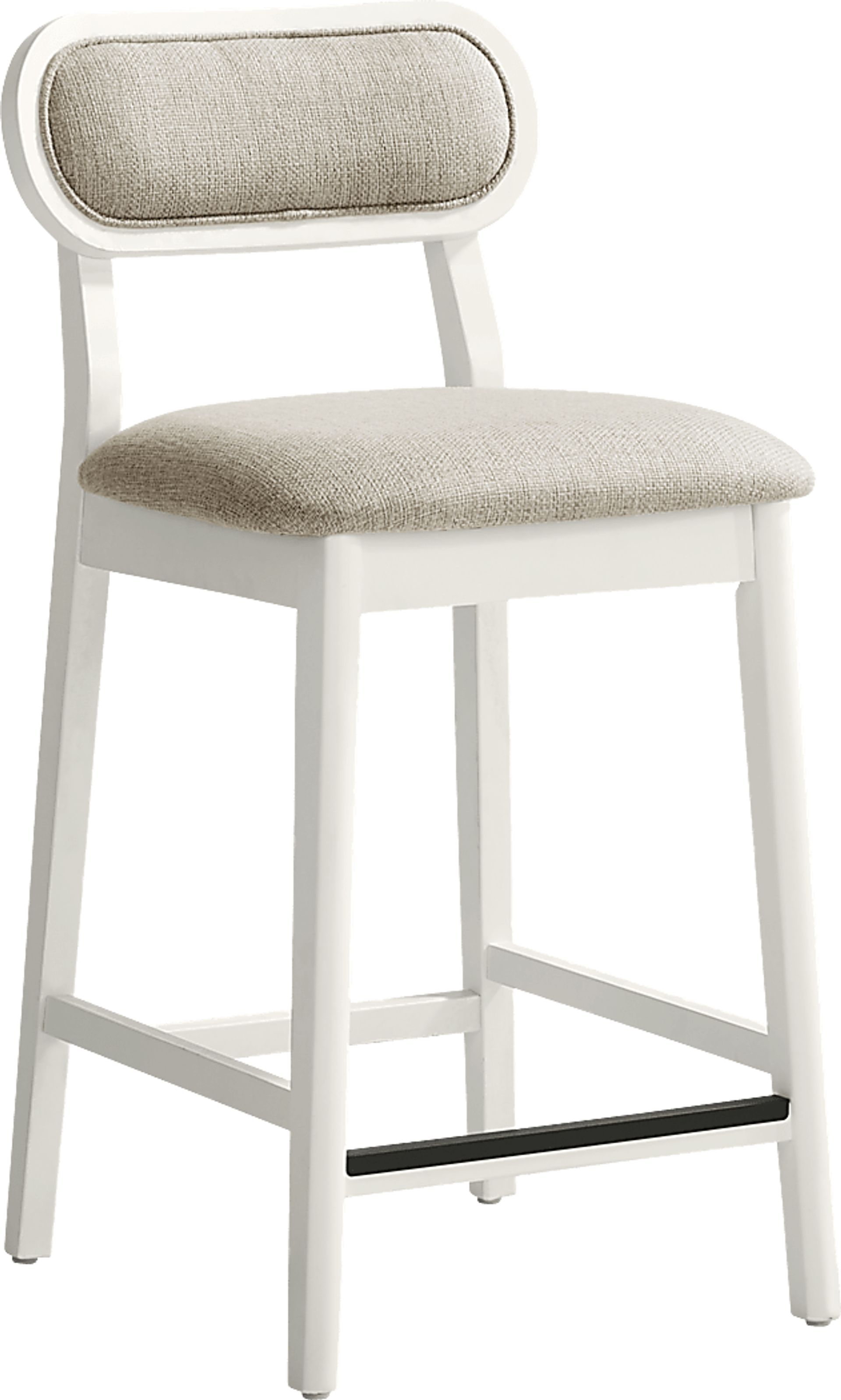 With an inviting, cheerful style that brings great times and wide smiles, the counter height Watertown dining chair sets the tone for the joy of meals shared. Okoume wood veneers in a white finish are shaped into organic curves in a contemporary take on midcentury-inspired design. The seat cushion is upholstered in beige, with a matching cushion welted to the oval back. Details like angled back posts and a protected footrest add unique flair to this collection.