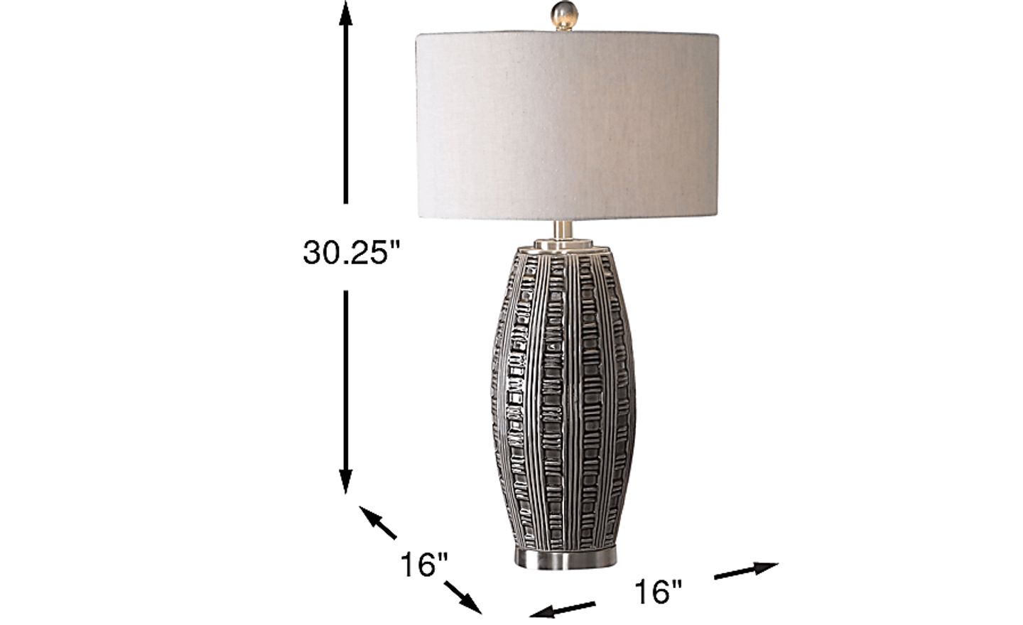 Artistically designed, the Watford Lane table lamp offers contemporary style to accentuate your space. Its ornate base is made of ceramic with a glossy gray finish. Adding a classic look, the natural-colored drum shade tops it off. This lamp accommodates a maximum 150-watt standard bulb and includes a three-way switch.