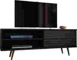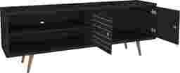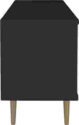 The Wavefruit black console is a high quality, beautifully crafted, functional unit. Featuring two open shelves, and one large, concealed compartment perfect for stashing DVDs, board games, electronics, and media accessories, this console is the ultimate gathering place and will create a statement in any space. Artful grooves mix well with any decor and splayed wooden legs add character and ease for moving. Customer assembly is required.