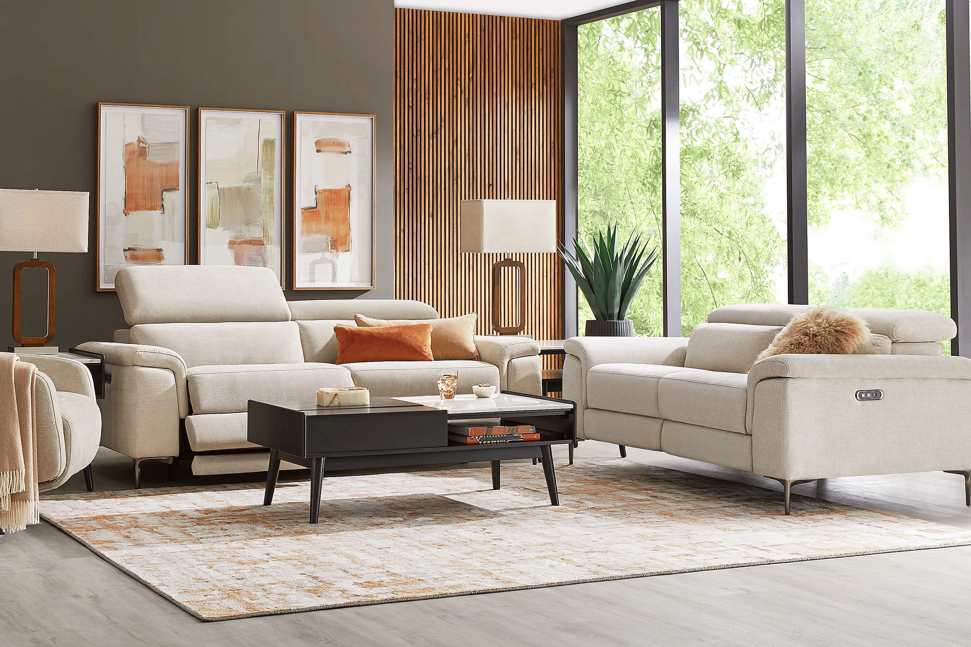 The peak of contemporary style and relaxation is closer than ever when the Weatherford Park living room comes home. This inspired set features a versatile beige fabric, all-around padding, and nuanced detailing like plush wedge arms, poised metal legs and top-stitched seams. The sofa and loveseat both feature dual power reclining, with powered headrests and footrests in each seat independently adjustable at the push of a button for ultimate comfort. An included USB port on each dual power seat also keeps convenient charging close at hand. Upholstery: 100% Polyester. Cleaning Instructions: Use water-based cleaning agents or foam. Accent pillows not included.