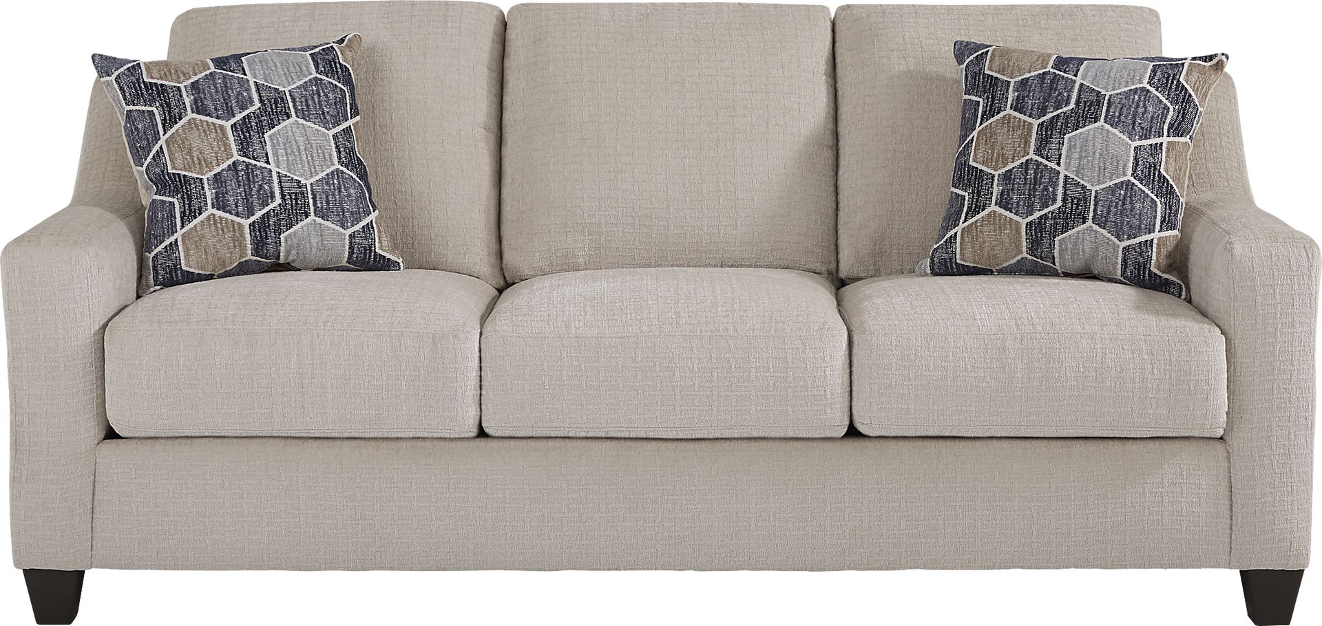 Contemporary in style, the Wembley Park sofa is a wonderful addition to your home's living room space. Upholstered in a soft chenille fabric, this stylish piece comes in a beige color and features sophisticated track arms and block legs in a rich brown finish. The included accent pillows add a nice touch of color. Upholstery: 100% Polyester.