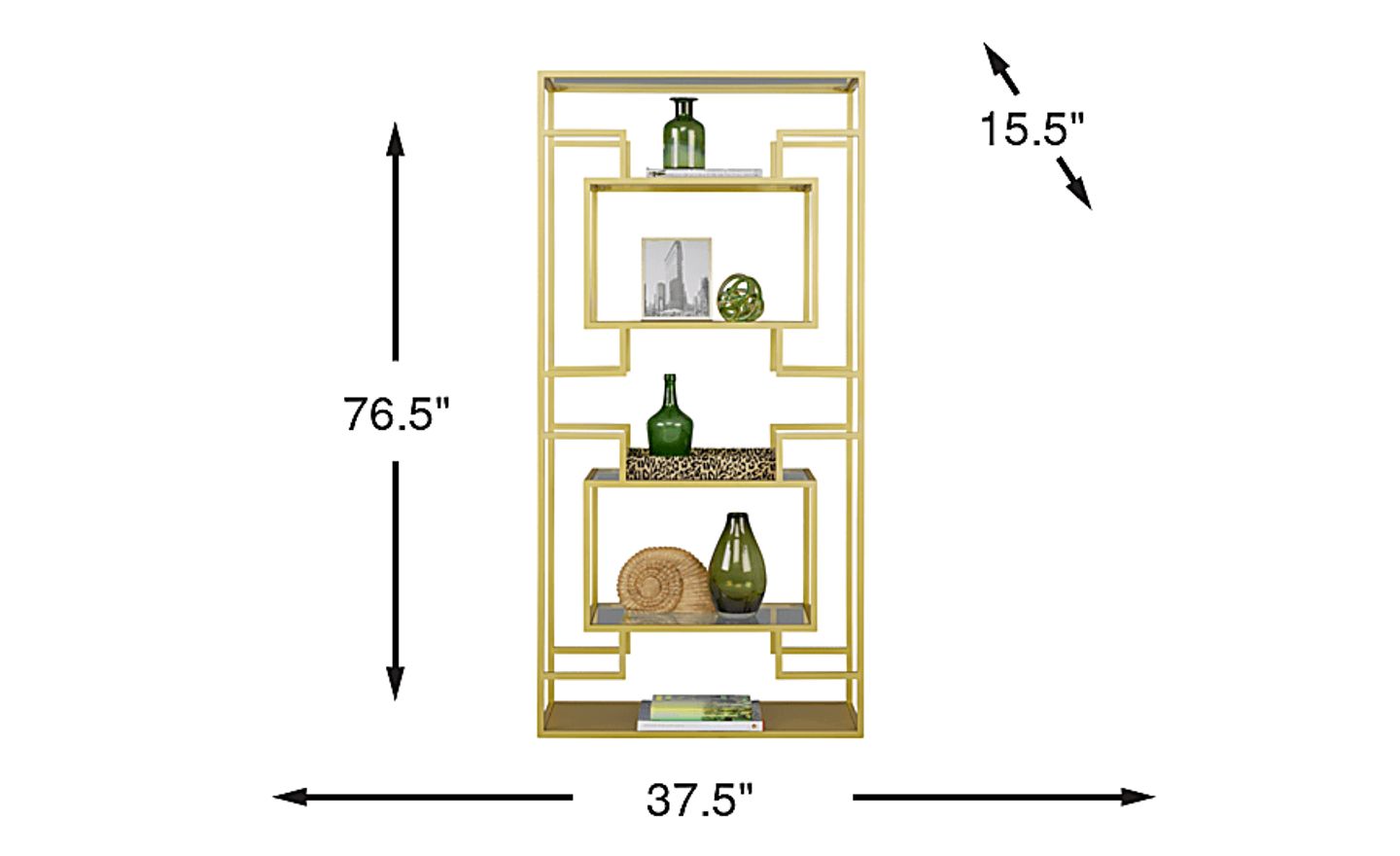 A champion of contemporary decor, the West Bridge room divider dazzles. Constructed of sturdy steel and iron, this room divider's geometric design instantly instills a sense of appreciation and wonder. Featuring a glass top panel, metal bottom panel and four glass shelves at varying heights, it offers a spacious display for your collections. Two cubic structures inside create a one-of-a-kind floating box effect. A gold powder coat finish brings extra shine and adds a touch of elegance to this piece.