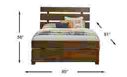 Cool, contemporary and cozy, the West Hills bed is the perfect spot to lay your head each night. Crafted of wood solids with acacia veneers in a warm brown finish, this panel style bed features a chic horizontal slat headboard and footboard design accented with metal trim featuring oversized grommets. Mattress and foundation (if required) sold separately. Bed shown is queen size.