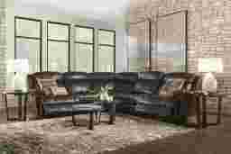 Complete your living room with the comfort and style of the West Valley sectional. This sectional is upholstered in top grain leather where the body touches in a rich brown color. Padded arms and deep seating pair with the power reclining feature to help you relax. USB charging ports on the outside of the arms help keep your devices charged and handy. Top grain leather where the body touches with vinyl sides and back.