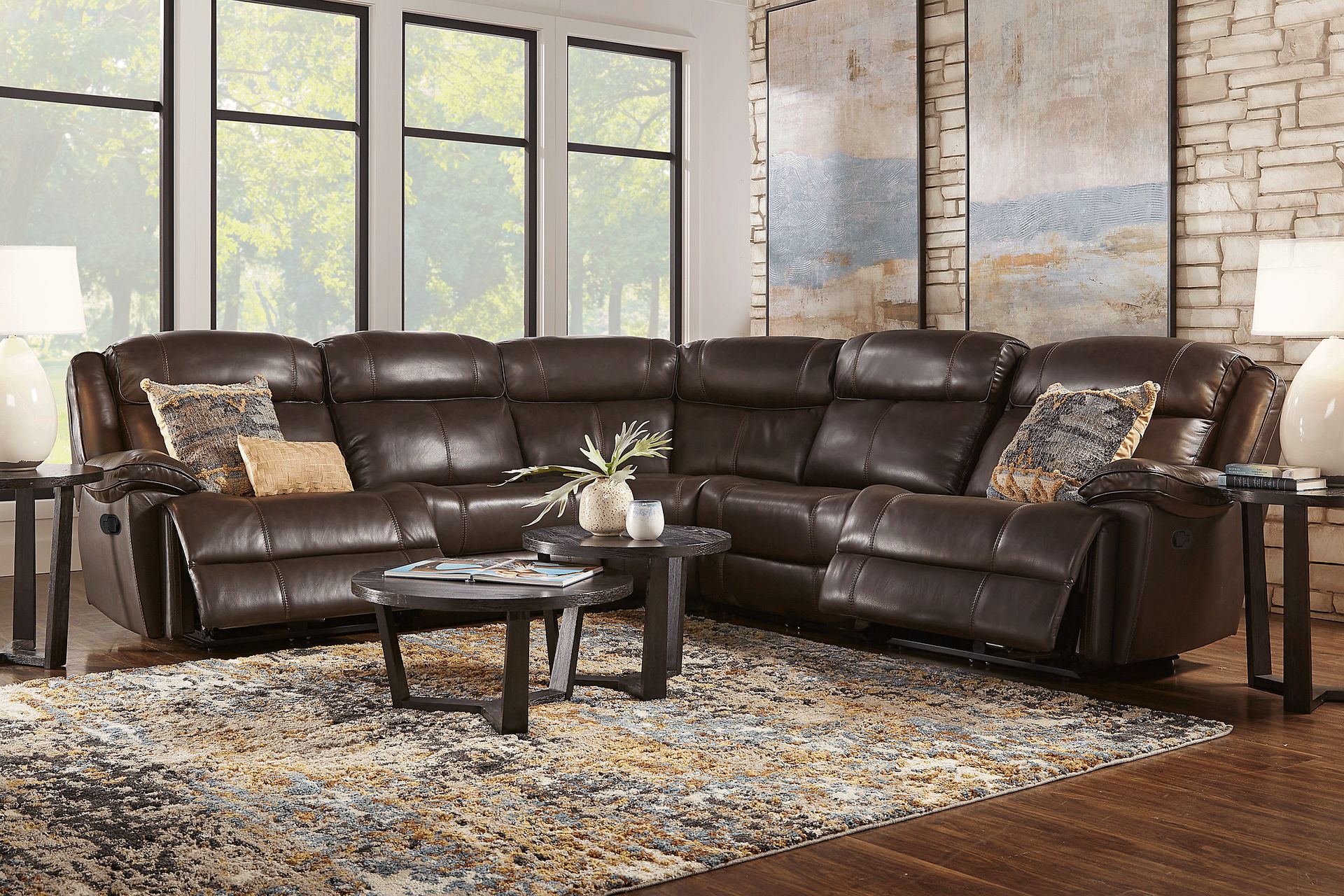 Complete your living room with the comfort and style of the West Valley sectional. This sectional is upholstered in top grain leather where the body touches in a rich brown color. Padded arms and deep seating pair with the reclining feature to help you relax. Top grain leather where the body touches with vinyl sides and back.