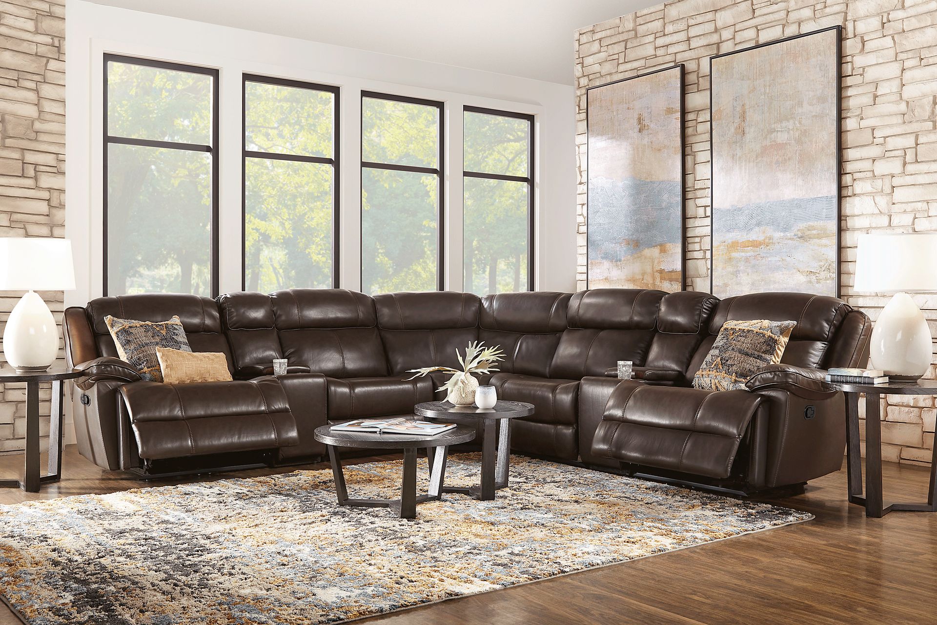 Complete your living room with the comfort and style of the West Valley sectional. This sectional is upholstered in top grain leather where the body touches in a rich brown color. Padded arms and deep seating pair with the reclining feature to help you relax. Two consoles add twin cupholders and a lift-top storage area each. Top grain leather where the body touches with vinyl sides and back.