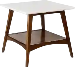 This piece embodies the Mid-Century Modern aesthetic through its clean, geometric square shape and iconic tapered legs. The contrast between the bold off-white top and the warm pecan finish provides the retro-inspired "pop" that is a hallmark of MCM design, allowing it to serve as a stylish focal point in a contemporary or vintage-inspired home.