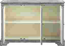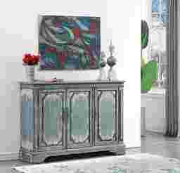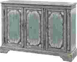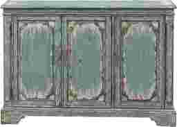 Antique-inspired, the Wester Road credenza offers chic, rustic style. Crafted of ash veneers, this piece features a charming hydra blue finish. Natural wood tones are revealed through the distressed finish, which lends this credenza a timeless look. Perfect for storage, its three doors open up to shelved compartment space.