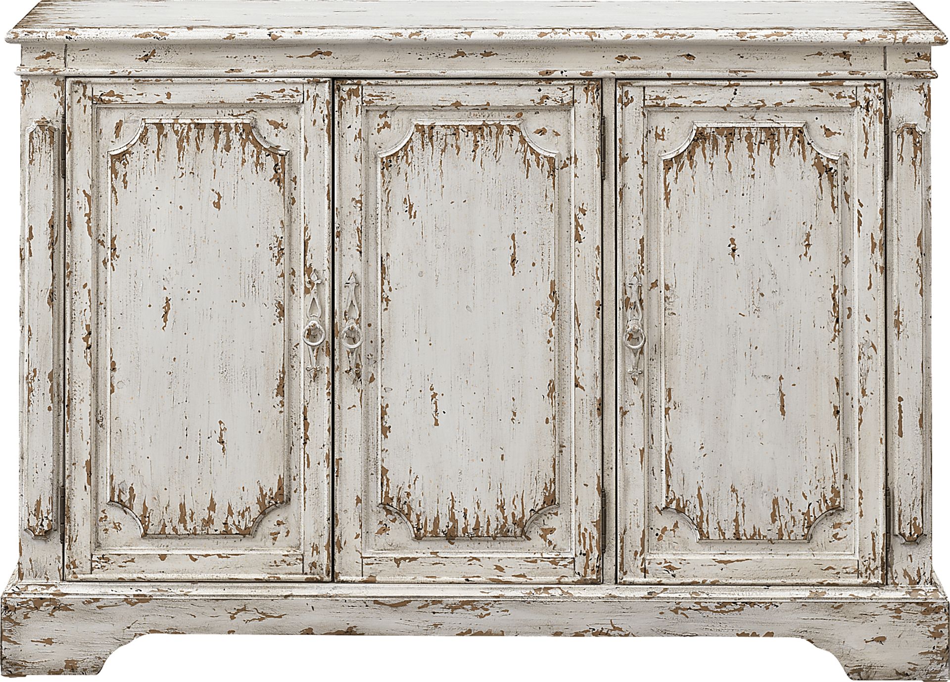 Antique-inspired, the Wester Road credenza offers chic, rustic style. Crafted of boxwood veneers, this piece features a charming cream finish. Natural wood tones are revealed through the distressed finish, which lends this credenza a timeless look. Perfect for storage, its three doors open up to shelved compartment space.