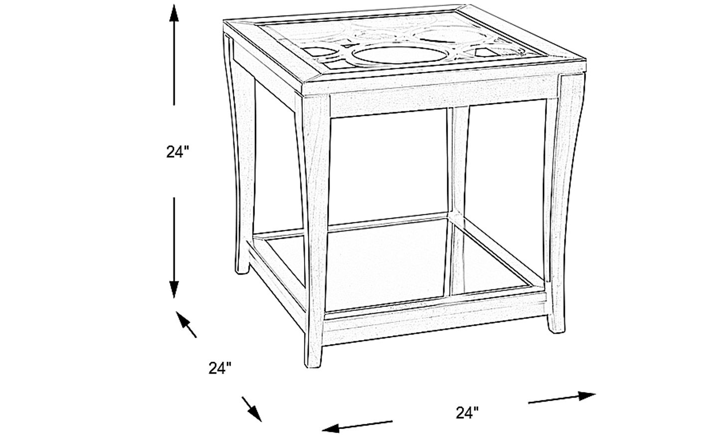 Crafted of pine wood solids with birch veneers in a deep ebony finish, a modern circular design set beneath a beautifully beveled, tempered glass surface gives the Westfield end table a unique, contemporary feel. A mirrored bottom shelf accentuates the elegant design of this piece.