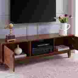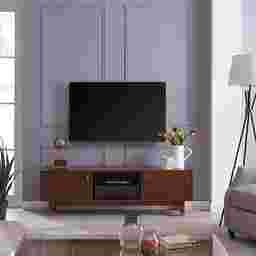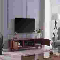Widen your horizons. Swing low with this wide-body, low profile Westleigh media stand. Open shelving and storage cabinets tidy up media accessories, entertaining accoutrement, or even entryway necessities. Boxy silhouette and dark tobacco hue highlight the midcentury design. Customer assembly is required.