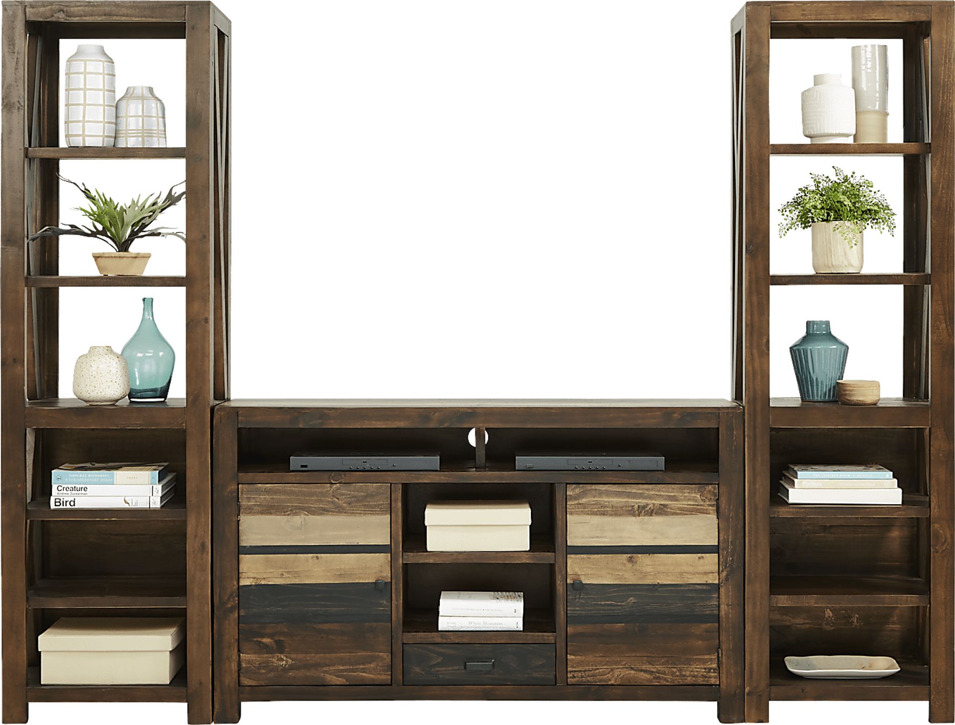 Boasting rustic contemporary style, the Westover Hills console is a practical and stylish storage solution for your living room. Perfect for your TV and entertainment accessories, this piece is crafted of Brazilian pine in a beautiful brown finish. Two side doors combine with a middle drawer to offer plenty of concealed storage. Plus, helping you stay organized are two small shelves in the center. An additional shelf extends along the top, just underneath the surface, providing a handy spot to place consoles and more. Designed with convenience in mind, a hole for cable management makes it easy to plug in electronic devices and complete your setup. This wall unit includes two piers to display art, photos and decor.