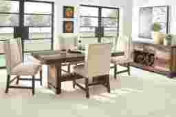 Serve up stylish meals with the Westover Hills dining room. It offers a contemporary aesthetic with warm rustic touches, lending itself in both industrial lofts and modern homes. Crafted from solid pine wood, the table features a slat-lined top and trestle base with exposed knots and natural distressing details. An inviting combination of light and dark brown tones are striated along the table's rectangle slat surface and base, creating a distinctive look. Each side chair features neutral upholstery accented by nailhead trim.