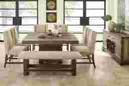 Make a statement at your dining table with the Westover Hills side chair. Stylish at any angle, neutral upholstery is accented by nailhead trim. The legs are crafted from solid pine wood in a brown finish, making it an excellent example of contemporary-meets-rustic styling.
